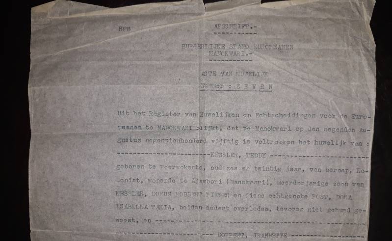 In de jaren vlak na de oorlog krijgt mevrouw Ungermann, nog in Bandung, af en toe bezoek van haar goede vriendin en weduwe Dora Kessler-Post. Op een van haar bezoekjes wordt ze vergezeld door haar zoon Teddy, ofwel opa. Zijn oog valt al snel voor de nog minderjarige Jeanette. In 1949 wordt de Indonesische nationaliteit een verplichting. Als antwoord daarop verkiezen vele Europeanen er voor om op basis van hun paspoort naar Nederland te vertrekken. Het nog te ontginnen Nieuw Guinea valt op dat moment nog wel in Nederlandse handen. Opa's moeder Dora overlijdt in augustus 1949. Hij staat er dan alleen voor. Vanwege haar goede vriendschap met moeder Dora, neemt ze opa onder haar hoede en dus mee naar Manokwari. Intussen bloeit de liefde op tussen oma en opa. Als mevrouw Ungermann hier lucht van krijgt, schopt ze opa uit huis. De eerste nachten slaapt hij in een tent vlakbij de boerderij van de Ungermanns in Andai. Op een gegeven moment heeft hij een optrekje in Manokwari in een omgeving die Ajam Bori wordt genoemd. Oma woont dan waarschijnlijk met een Ungermann familielid in kampung Fandini. Waarschijnlijk had mevrouw Ungermann gehoopt oma uit te huwelijken aan een van haar eigen zonen. Omdat oma nog minderjarig is kan ze geen kant op. Samen besluiten oma en haar grote liefde te wachten tot haar 21e verjaardag. Op 19 juli 1950 is het zover. Oma verlaat de familie Ungermann om samen met opa in Ajam Bori op eigen benen te staan. Op 9 augustus 1950 treden ze te Manokwari in het huwelijk. Onder een fragment van hun huwelijksakte: