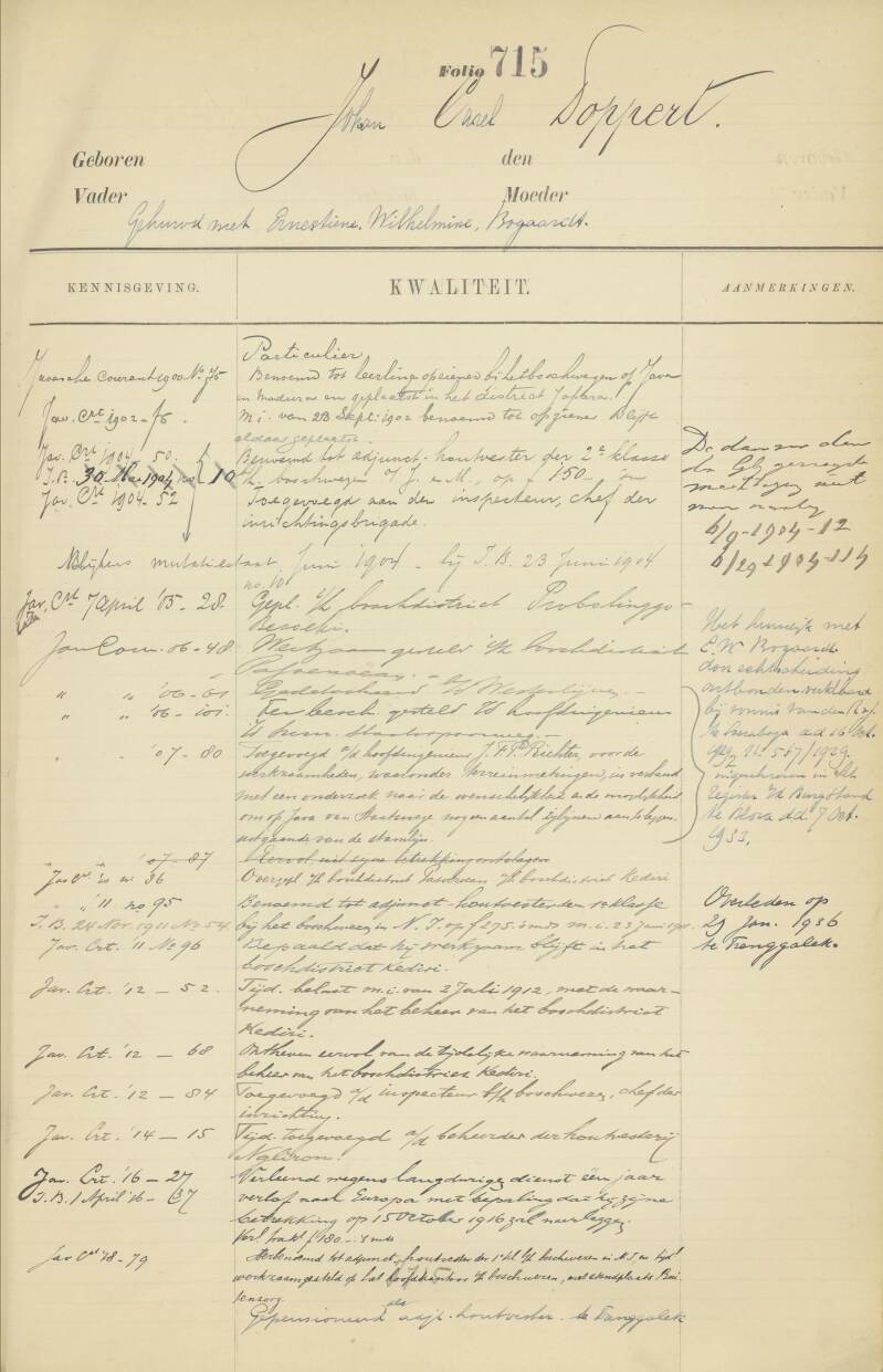 Verhuisd naar Tjepoe (Rembang) om bij dochter Ernestine en schoonzoon Carel Doppert,aldaar adjunct houtvester, in te trekken met de drie jongste kinderen.