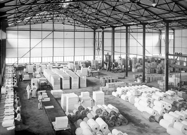 Foto van de papierfabriek in Padalarang, ten noordwesten van Bandung omstreeks 1940 en een foto van de sorteer en pakzaal. (Collectie Tropenmuseum), dat tijdens de oorlog fungeerde als gevangenkamp.